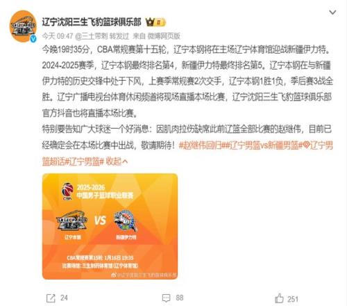 辽宁男篮官方宣布,因肌肉拉伤缺席此前辽篮全部比赛的赵继伟,目前已经确定会在本场比赛中出战。